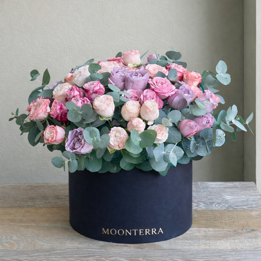 This flower arrangement in a box features a soft blend of blush, pink, and lavender roses paired with fresh eucalyptus. Gentle pastel tones create a calm, balanced look, while layered blooms add depth and volume without feeling heavy. Designed to feel refined and modern, this arrangement works beautifully for birthdays, celebrations, or simply elevating the space around it. Flower shades may vary slightly depending on availability.