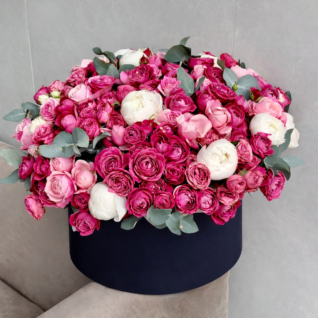 This is a flower arrangement in a box made with pink spray roses, soft pink roses, white peonies, and eucalyptus. The mix of deep pink, light pink, and white flowers creates a full look, with round peonies adding contrast among the roses. Placed in a dark box, the colors stand out while still feeling calm and balanced.